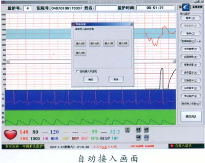 床邊機(jī)一開機(jī)進(jìn)入監(jiān)護(hù)狀態(tài),孕婦的住院號、姓名及各種監(jiān)護(hù)信息自動的傳到中央監(jiān)護(hù)主機(jī)上,自動啟動中央監(jiān)護(hù)工作站開始監(jiān)護(hù),監(jiān)護(hù)結(jié)束后自動存儲監(jiān)護(hù)信息, 實(shí)現(xiàn)了自動監(jiān)護(hù)無人值班,極大方便了臨床應(yīng)用。