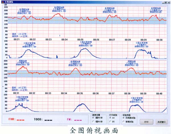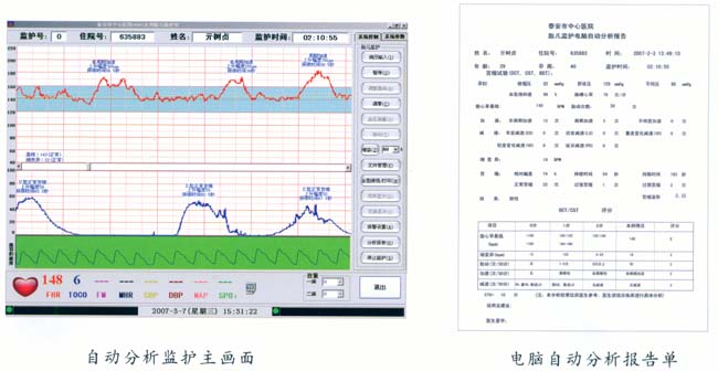在監(jiān)護(hù)中對胎心率基線、細(xì)變異大小、加速、各種減速及胎動的變化進(jìn)行實(shí)時(shí)在線分析,并將分析結(jié)果顯示在屏幕上,監(jiān)護(hù)結(jié)束時(shí)對所有的監(jiān)護(hù)信息進(jìn)行綜合分析,給出監(jiān)護(hù)診斷結(jié)果及胎兒評分供臨床參考,使得每個(gè)婦產(chǎn)科大夫都能輕松進(jìn)行胎兒監(jiān)護(hù)圖形分析和診斷。